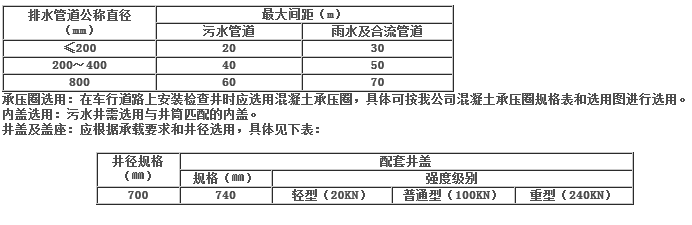 用井數量:應根據管線設置線路和直線管段****間距确定。檢查井在直線管段的**大間距應根據輸送介質種類、排水管管徑及疏通方法等具體情況确定,具體依照下表選用。