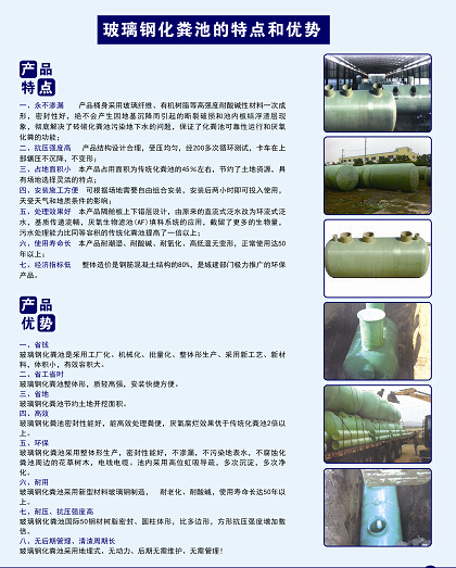 是在傳統化糞池的設計的基礎上改換了生産原材料,利用傳統化糞池厭氧化糞原理、利用了濾箱、濾池内加(AF)填料的新型技術使廢水中的COD去除率達到85%以上,使化糞池污水處理能(néng)力優于傳統化糞池,從而延長了玻璃鋼化糞的清掏周期。